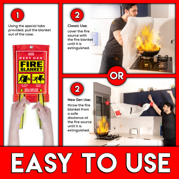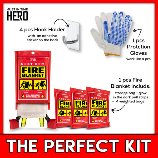 In every purchase of a pack of JustinTime Hero fire blanket, you receive a pair of fire resistant gloves for extra safety. The cover of the JustinTime Hero Fire Blanket is colored red with glow-in-the-dark straps to make it easy to find in any situation. You should always know where your fire blanket is so we provide you with a hook which means you can hang it anywhere that’s convenient to you (just never over the stove-top)